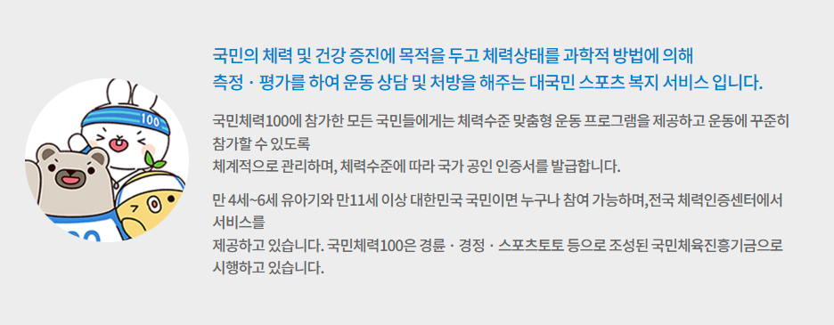 국민체력100은 문화체육관광부와 국민체육진흥공단이 운영하는 무료 체력측정 및 맞춤형 운동 상담 프로그램입니다.