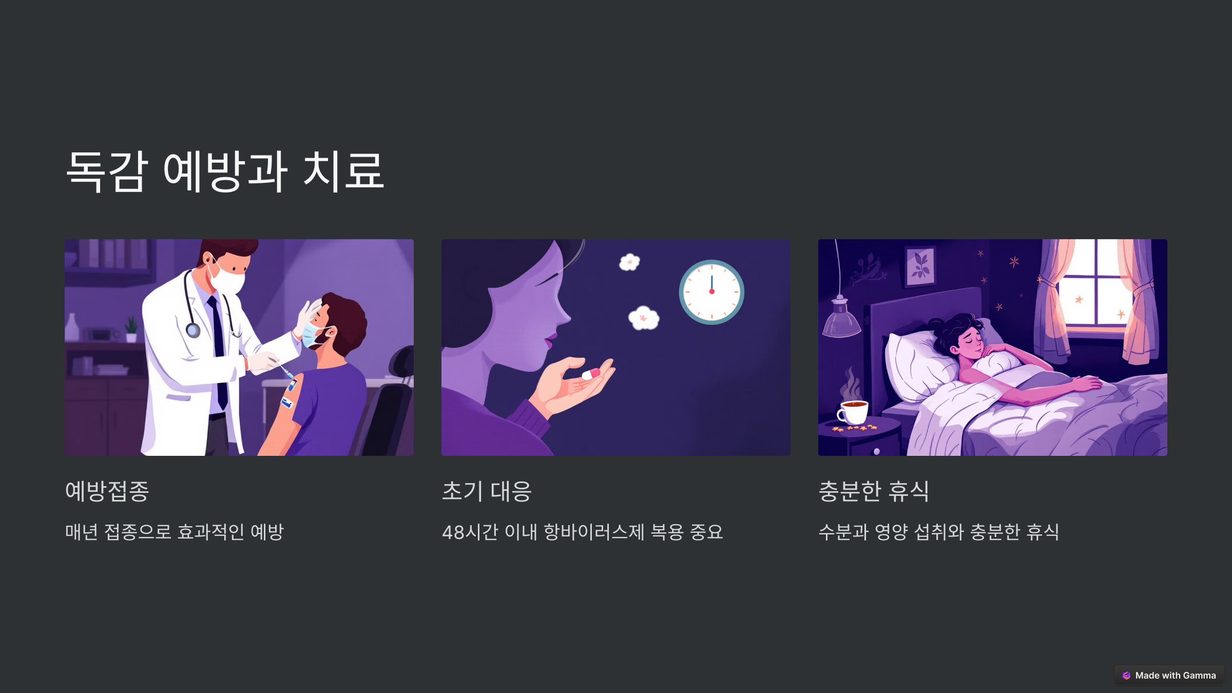 - 증상이 심하면 타미플루(항바이러스제) 처방 필요