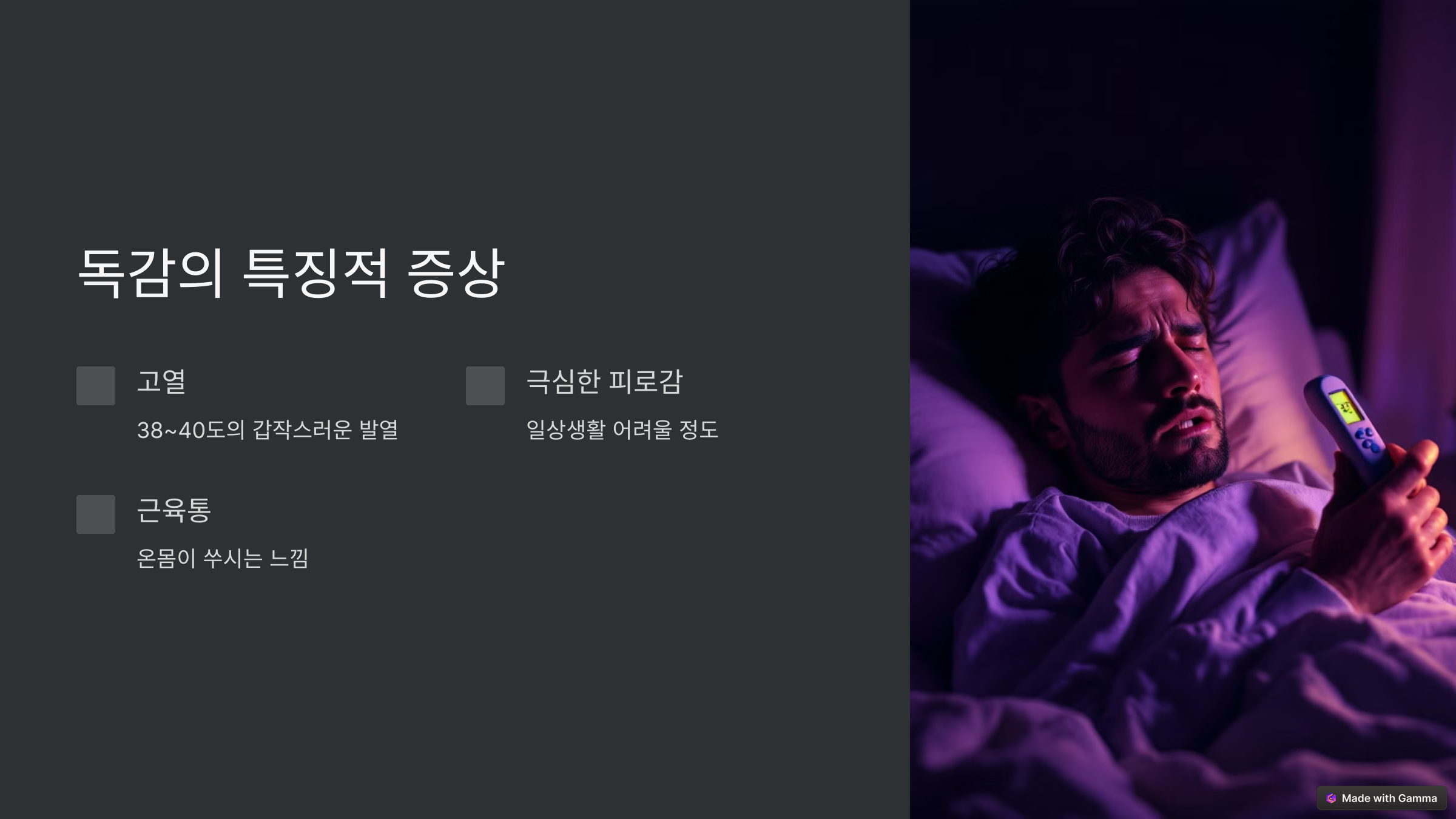 독감은 갑작스럽게 시작되며, 고열(38~40도)과 함께 오한, 극심한 피로감, 근육통이 동반되는 것이 특징이에요. 특히, 몸살이 심하게 오는 경우가 많아 온몸이 쑤시는 느낌을 경험하게 됩니다.
