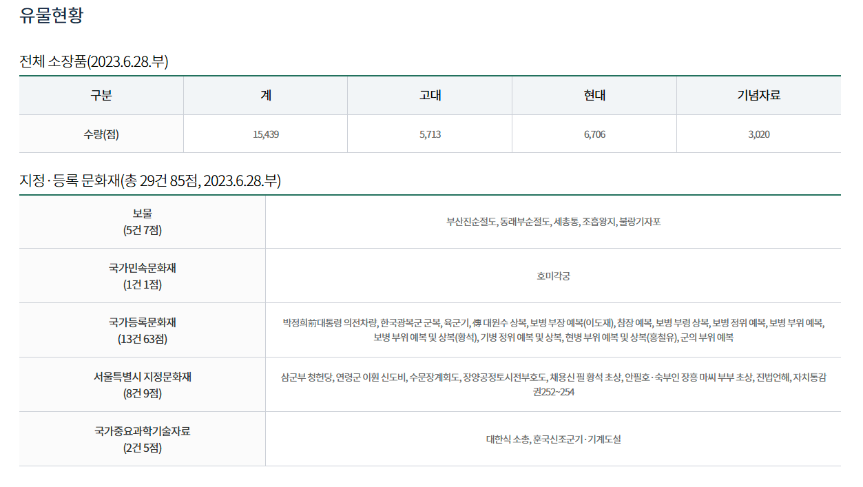 | 전투 장비 및 무기 | 한국전쟁 및 현대전에 사용된 다양한 무기와 전투 장비 전시 |