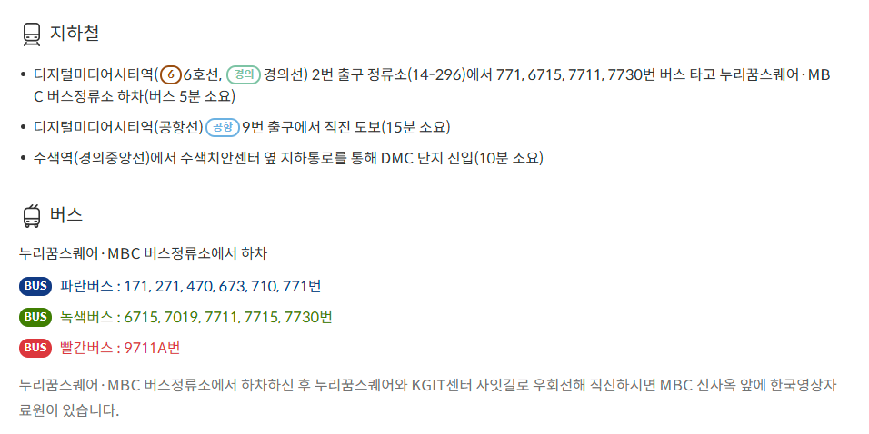 | 🚆 대중교통 | 지하철: 6호선, 경의중앙선, 공항철도 DMC역 9번 출구 도보 10분 버스: 271, 470, 7711, 7730 (DMC 홍보관 하차) |